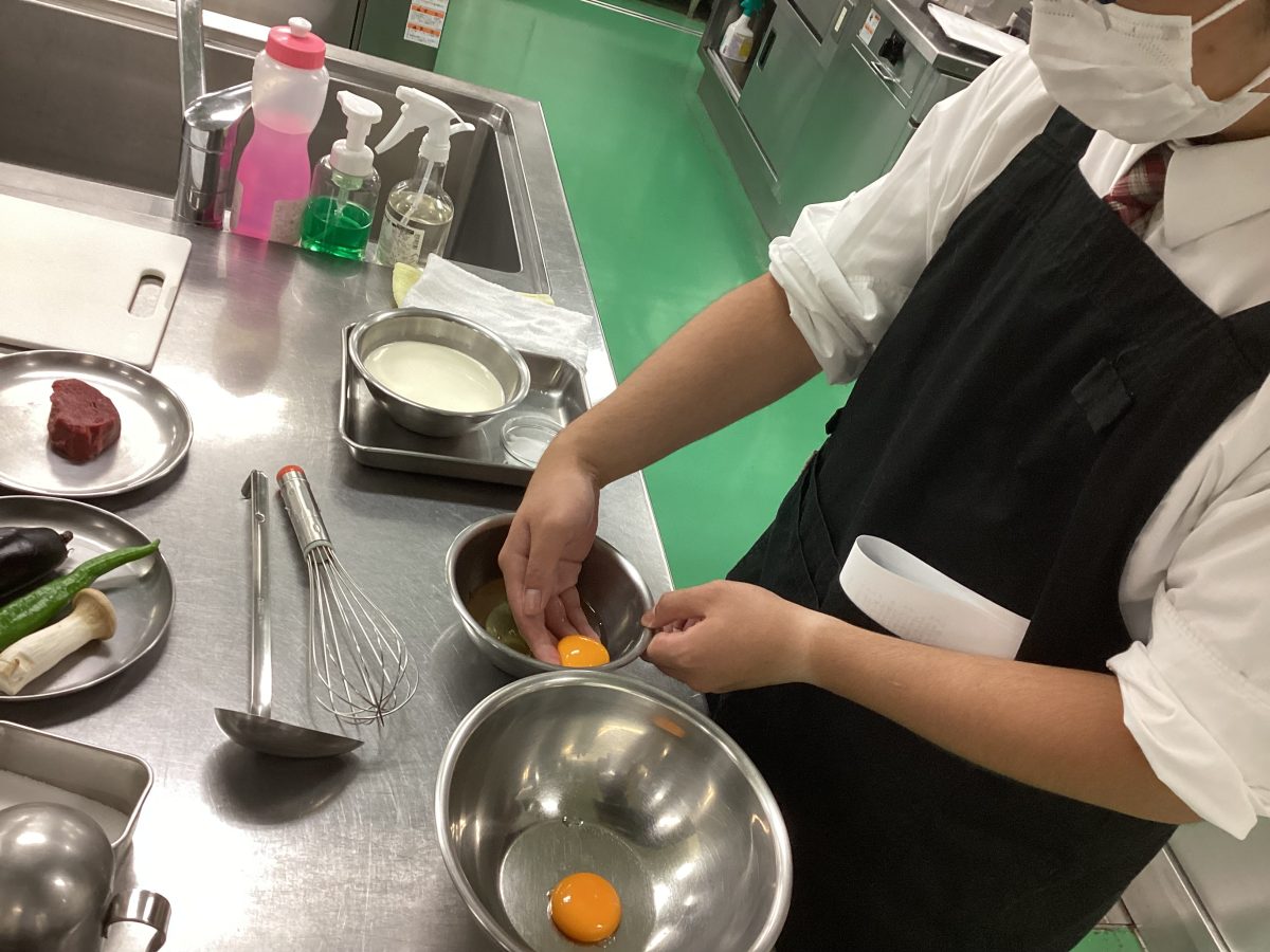 卵黄だけを使うときは、こうして指を使って卵白から取り出します(写真左)。たくさんのお客様分を調理するためには、この方法が一番実践的なんですって。