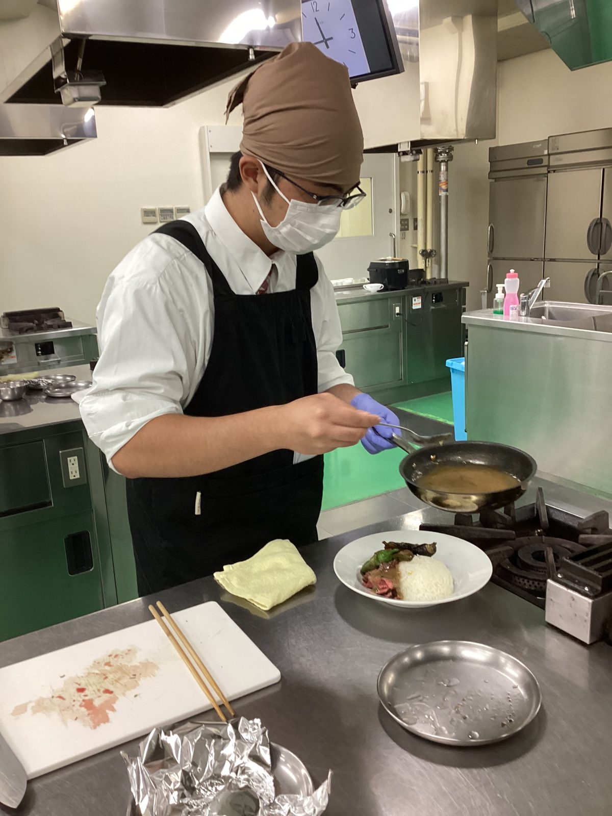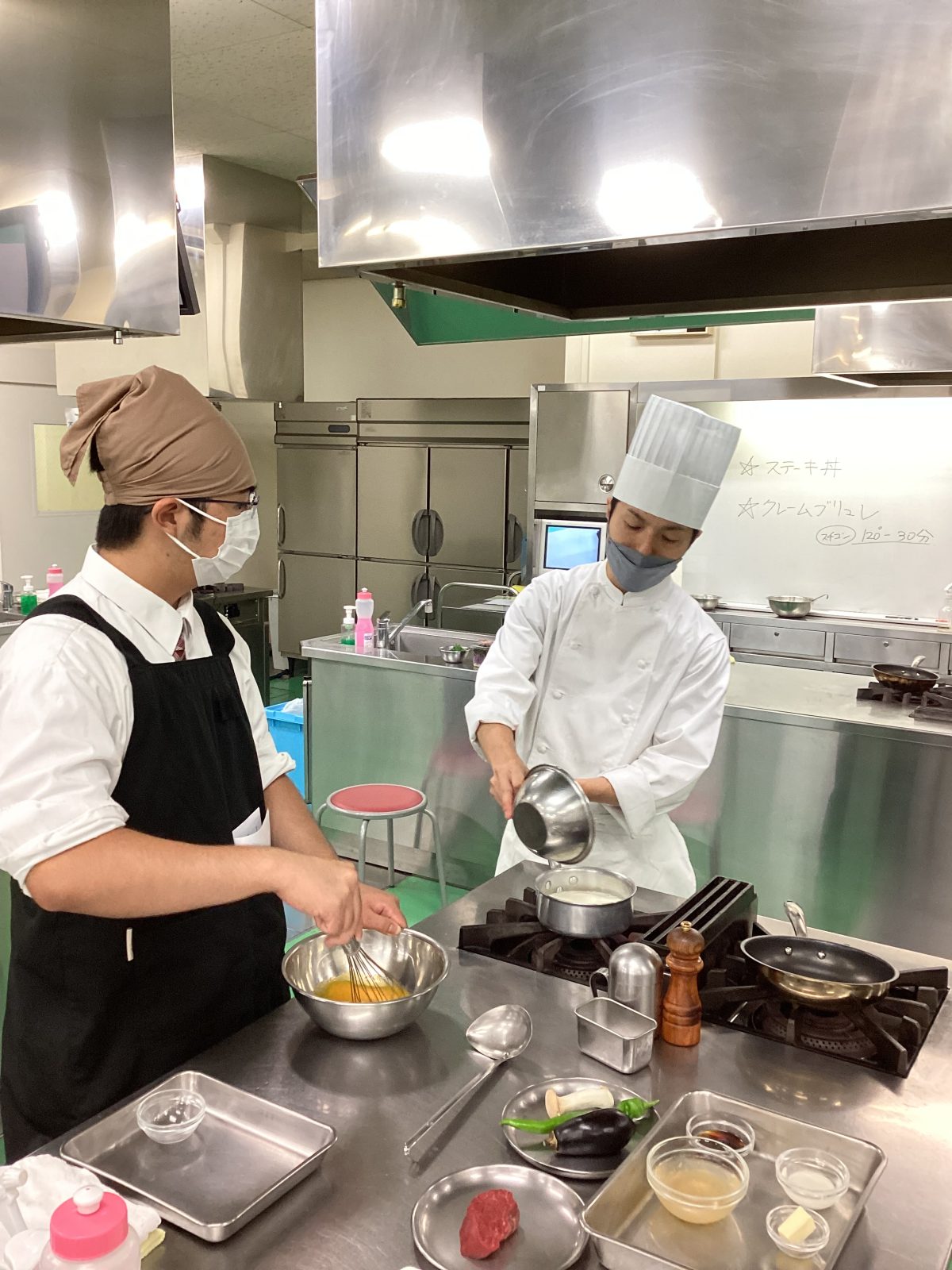 今日の連携授業は、特性和風ソースのステーキ丼、クリームブリュレを実際に作ってみる、というとても実践的な内容でした。